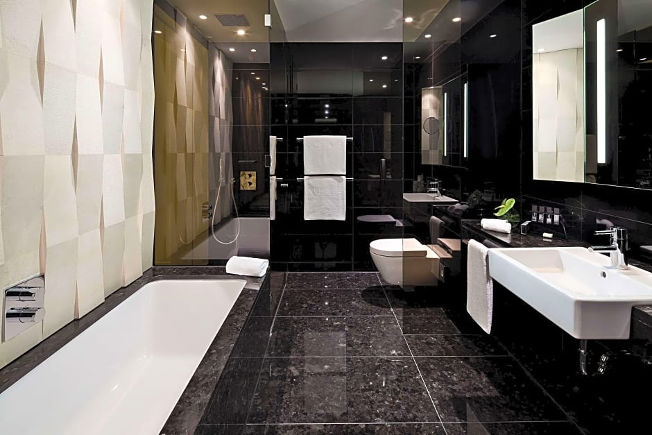 Fitted with floor-to-ceiling windows and cutting-edge technology, these spacious and modern double rooms feature a seating area and amenities such as a flat-screen TV, a safe, a mini-bar (surcharge), and a Nespresso coffee machine (with 2 free capsules per day). The bathroom comes with a rain shower, a hairdryer and free toiletries, and most of the bathrooms furthermore have a bath tub."
